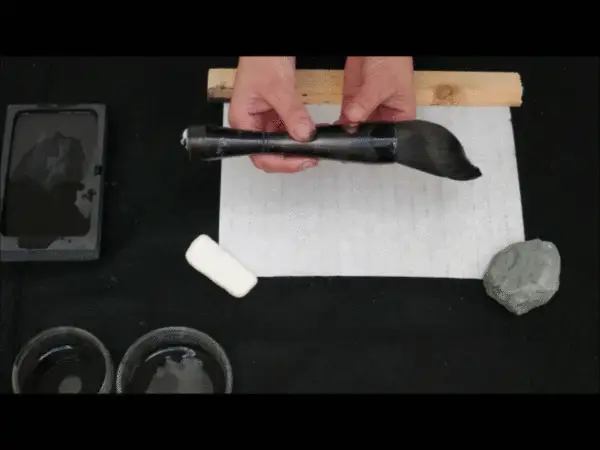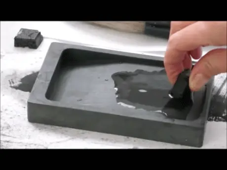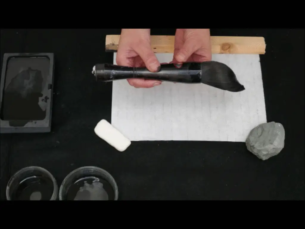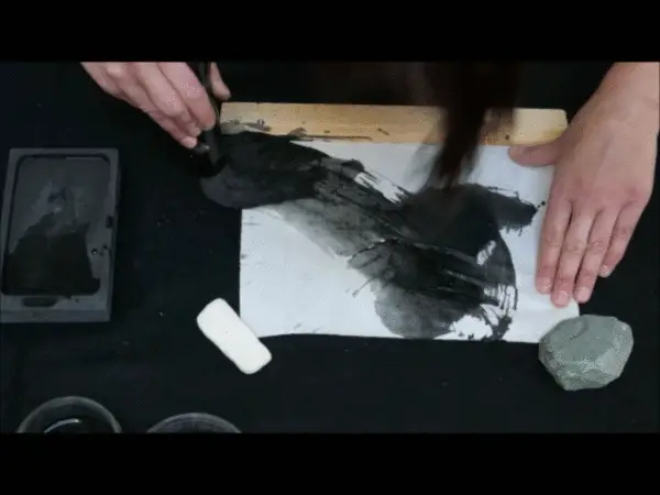 The ink is rubbed in meditative preparation for the work. The brush is then carefully filled with the Sumi ink before starting work. Without a preconceived plan, the brush on paper follows the inhalation and the exhalation. Each breath is affected by the previous breath and the previous breaths.