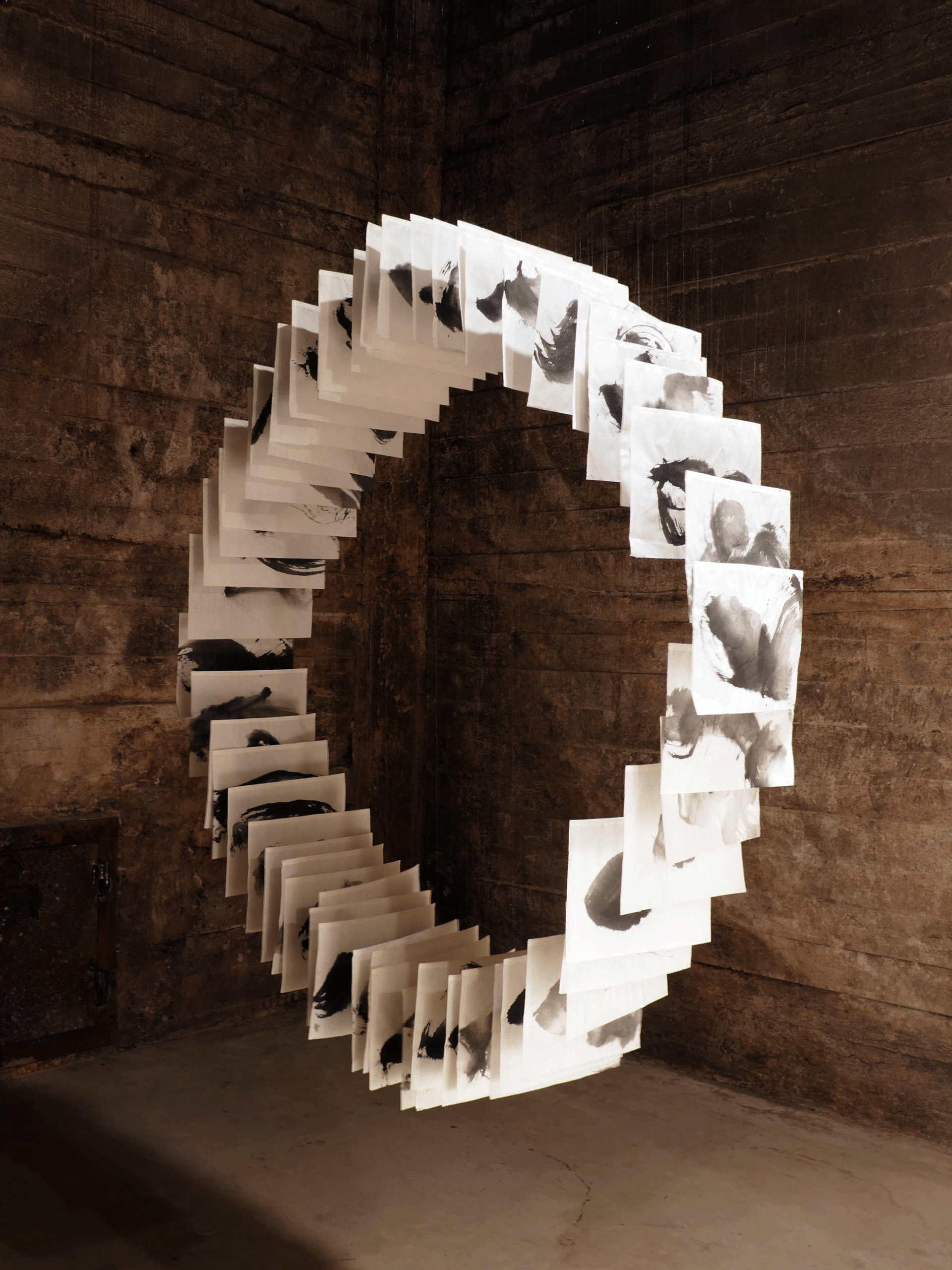 In this installation, 58 breaths hang in a circular shape. There is a breath on each sheet of rice paper; consisting of an inhalation and an exhalation. The installation hangs and moves on air currents that are present in the room. Seen in this way, the work itself also seems to breathe.